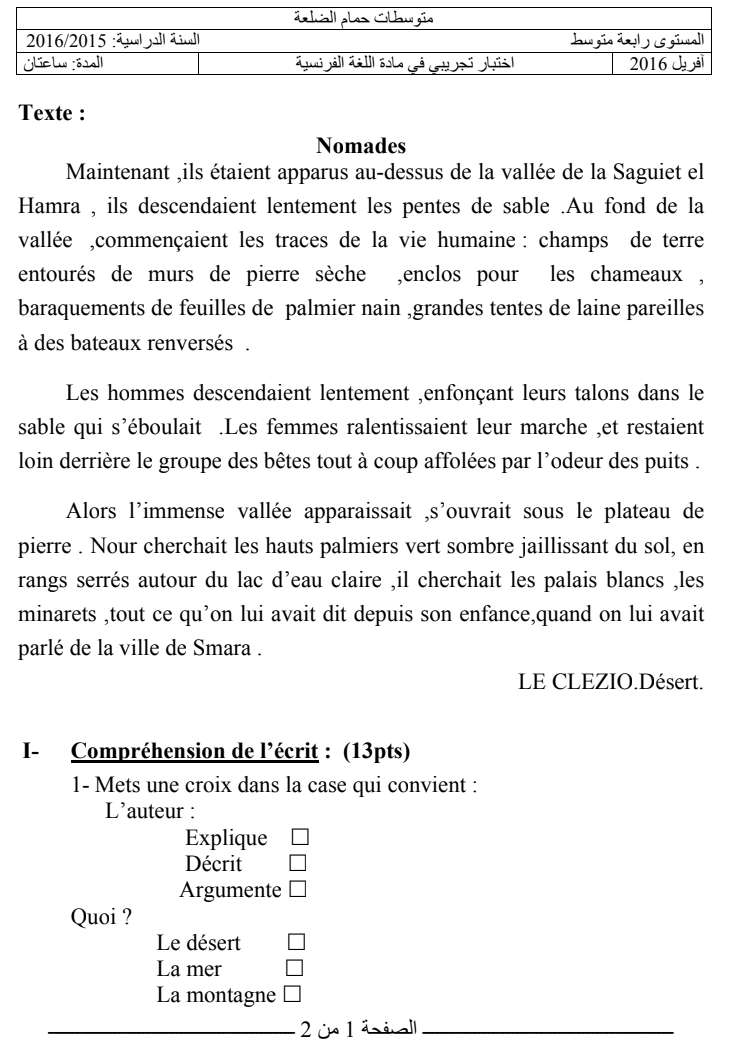 موضوع تجريبي في اللغة الفرنسية للتحضير لشهادة التعليم المتوسط 2019
